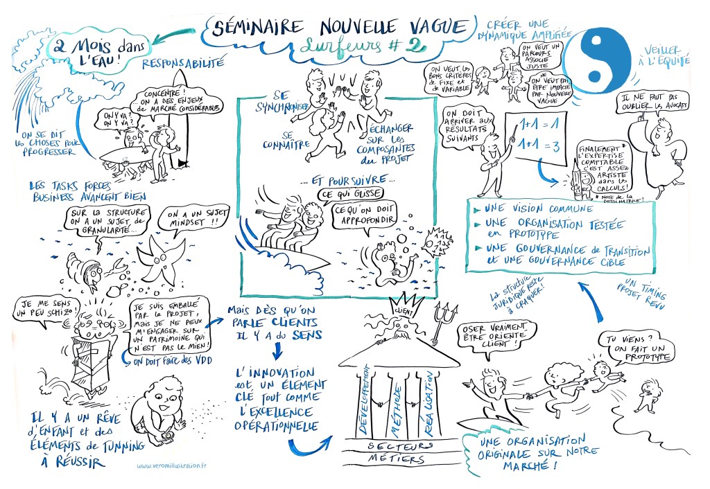 Lorsque je prépare un séminaire avec des consultants, j’aime bien explorer la possibilité de filer une métaphore. Ici, un exemple amusant autour du surf, idée que nous avons poursuivie à partir du nom du projet : « nouvelle vague ». Il en résulte la création d’une identité de groupe qui se construit de manière forte et fun.